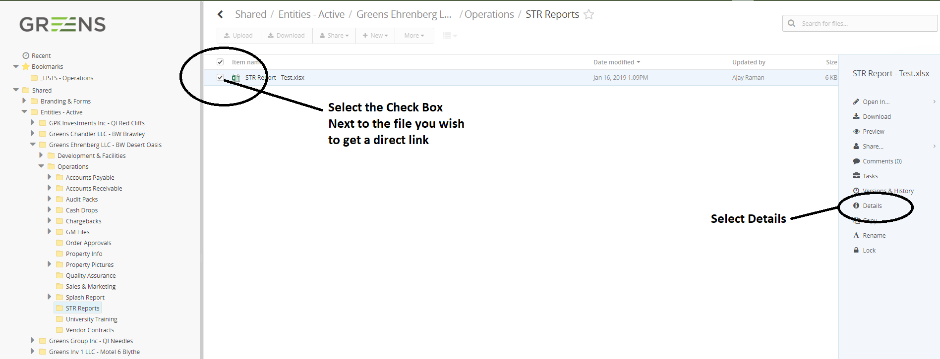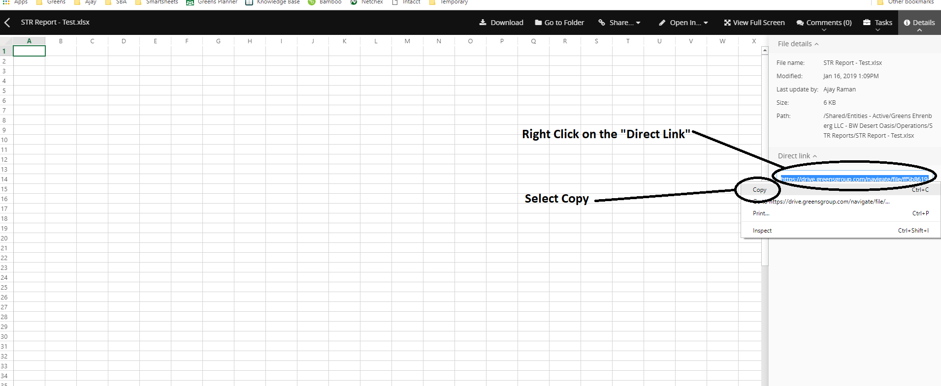 Greens maintains strict security standards for sharing internal documents. This procedure ensures that when you share files from Greens Drive, only authorized team members with proper access permissions can view them. Using direct links instead of downloading and re-uploading files saves time, preserves version control, and maintains our data security protocols.
